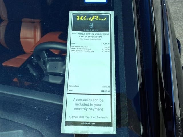 West Point Lincoln Kirkwood is honored to offer this stunning-looking 2025 Lincoln Aviator Reserve in Black Metallic with Harvest Bronze interior. Well equipped with Equipment Group 201A (Advanced Heads-Up Display, Auto Air Refresh, Lincoln BlueCruise Equipped (4-Years Included), Wheels: 22 Bright-Machined Aluminum, and Wireless Charging Pad), Illumination Package (Adaptive Dynamic Bending Lighting, Adaptive Pixel LED Headlamps, Illuminated Lincoln Star in Grille, Lincoln Dynamic Signature Lighting, and Speed Dependent Lighting), Luxury Package (30-Way Perfect Position Seats w/Active Motion, Heated & Ventilated Rear Seats, and Radio: Revel Ultima 3D Audio System w/28 Speakers), 14 Speakers, 3rd row seats: split-bench, 4-Wheel Disc Brakes, 40/Mini Console/40 Dual Captain's Chairs, ABS brakes, Adaptive suspension, Air Conditioning, All-Weather 1st & 2nd Row Floor Liners, Alloy wheels, AM/FM radio: SiriusXM, Apple CarPlay/Android Auto, Audio memory, Auto High-beam Headlights, Auto-dimming door mirrors, Auto-dimming Rear-View mirror, Automatic temperature control, Brake assist, Bumpers: body-color, Compass, Delay-off headlights, Driver door bin, Driver vanity mirror, Dual front impact airbags, Dual front side impact airbags, Electronic Stability Control, Emergency communication system: SYNC 4 911 Assist, Four wheel independent suspension, Front anti-roll bar, Front Bucket Seats, Front Center Armrest, Front dual zone A/C, Front License Plate Bracket, Front reading lights, Full Rear Console, Fully automatic headlights, Garage door transmitter, Heads-Up Display, Heated door mirrors, Heated front seats, Heated steering wheel, HVAC memory, Illuminated entry, Knee airbag, Leather steering wheel, Lincoln Digital Experience, Low tire pressure warning, Memory seat, Navigation system: Connected Navigation (1-year trial), Occupant sensing airbag, Outside temperature display, Overhead airbag, Overhead console, Panic alarm, Passenger door bin, Passenger vanity mirror, Power door mirrors, Power driver seat, Power Liftgate, Power moonroof: Panoramic Vista Roof, Power passenger seat, Power steering, Power windows, Premium Lthr Heated/Ventilated Fnt Captain's Chairs, Radio data system, Radio: Revel Audio System w/14 Speakers, Rain sensing wipers, Rear air conditioning, Rear anti-roll bar, Rear audio controls, Rear dual zone A/C, Rear reading lights, Rear window defroster, Rear window wiper, Remote keyless entry, Security system, SiriusXM, Speed control, Speed-Sensitive Wipers, Split folding rear seat, Spoiler, Steering wheel memory, Steering wheel mounted A/C controls, Steering wheel mounted audio controls, Tachometer, Telescoping steering wheel, Tilt steering wheel, Traction control, Trip computer, Turn signal indicator mirrors, Variably intermittent wipers, Ventilated front seats, and Wheels: 21 Bright-Machined Aluminum.
