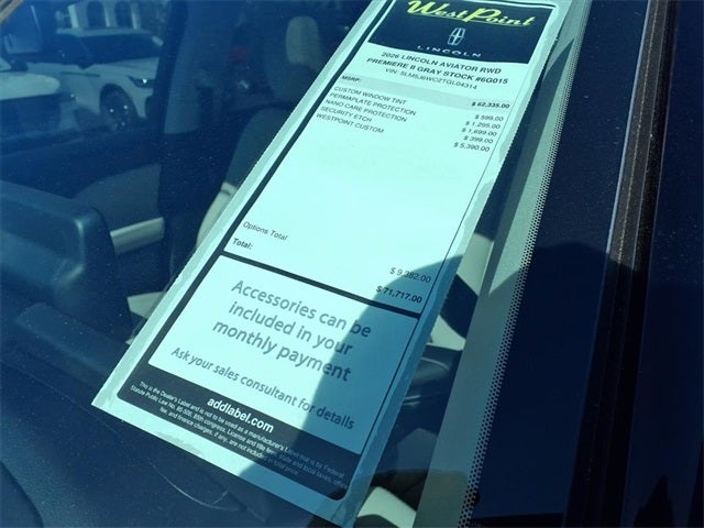 West Point Lincoln Kirkwood is delighted to offer this good-looking 2026 Lincoln Aviator Premiere in Harbor Gray with Light Space Gray & Onyx interior. Well equipped with Equipment Group 101A (Auto Air Refresh, Auto Heated & Ventilated Driver & Passenger Seats, Lincoln BlueCruise Equipped (4-Years Included), Panoramic Vista Roof w/Power Shade, Power Tilt & Telescoping Steering Column w/Memory, and Wireless Charging), Lincoln Connectivity Package (4-years included), 10 Speakers, 3rd row seats: split-bench, 4-Wheel Disc Brakes, ABS brakes, Adaptive suspension, Air Conditioning, All-Weather 1st & 2nd Row Floor Liners, Alloy wheels, AM/FM radio: SiriusXM, Apple CarPlay/Android Auto, Audio memory, Auto High-beam Headlights, Auto-dimming door mirrors, Auto-dimming Rear-View mirror, Automatic temperature control, Brake assist, Bumpers: body-color, Compass, Delay-off headlights, Driver door bin, Driver vanity mirror, Dual front impact airbags, Dual front side impact airbags, Electronic Stability Control, Emergency communication system: 911 Assist, Exterior Parking Camera Rear, Four wheel independent suspension, Front anti-roll bar, Front Bucket Seats, Front Center Armrest, Front dual zone A/C, Front License Plate Bracket, Front reading lights, Fully automatic headlights, Garage door transmitter, Heated door mirrors, Heated front seats, Heated steering wheel, HVAC memory, Illuminated entry, Knee airbag, Leather steering wheel, Lincoln Digital Experience, Lincoln Soft Touch Heated Comfort Seats, Low tire pressure warning, Memory seat, Navigation System, Occupant sensing airbag, Outside temperature display, Overhead airbag, Overhead console, Panic alarm, Passenger door bin, Passenger vanity mirror, Power door mirrors, Power driver seat, Power Liftgate, Power passenger seat, Power steering, Power windows, Radio data system, Radio: Lincoln Premium AM/FM/HD Audio System, Rain sensing wipers, Rear air conditioning, Rear anti-roll bar, Rear audio controls, Rear reading lights, Rear window defroster, Rear window wiper, Remote keyless entry, Security system, SiriusXM, Speed control, Speed-Sensitive Wipers, Split folding rear seat, Spoiler, Steering wheel mounted A/C controls, Steering wheel mounted audio controls, Tachometer, Telescoping steering wheel, Tilt steering wheel, Traction control, Trip computer, Turn signal indicator mirrors, Variably intermittent wipers, and Wheels: 20 Magnetic Bright-Machined Aluminum.