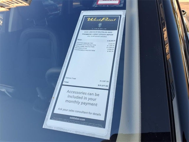 West Point Lincoln Kirkwood is excited to offer this charming 2026 Lincoln Nautilus Premiere in Gray with Black Onyx interior. Well equipped with Equipment Group 101A (19 Bright Machined Aluminum Wheels, BlueCruise Equipped (4-Years Included), Lincoln Digital Experience, Lincoln Soft Touch Heated Front Captain's Chairs, Radio: AM/FM Premium Audio, and SiriusXM with 360L), Lincoln Connectivity Package, 10 Speakers, 4-Wheel Disc Brakes, ABS brakes, Air Conditioning, Alloy wheels, AM/FM radio: SiriusXM with 360L, Apple CarPlay/Android Auto, Auto High-beam Headlights, Auto tilt-away steering wheel, Auto-dimming Rear-View mirror, Automatic temperature control, Brake assist, Bumpers: body-color, Compass, Delay-off headlights, Driver door bin, Driver vanity mirror, Dual front impact airbags, Dual front side impact airbags, Electronic Stability Control, Emergency communication system: 911 Assist, Exterior Parking Camera Rear, Four wheel independent suspension, Front anti-roll bar, Front Bucket Seats, Front Center Armrest w/Storage, Front dual zone A/C, Front reading lights, Fully automatic headlights, Garage door transmitter, Heated door mirrors, Heated front seats, Heated steering wheel, Illuminated entry, Knee airbag, Leather steering wheel, Low tire pressure warning, Memory seat, Navigation System, Occupant sensing airbag, Outside temperature display, Overhead airbag, Overhead console, Panic alarm, Passenger door bin, Passenger vanity mirror, Power door mirrors, Power driver seat, Power Liftgate, Power passenger seat, Power steering, Power windows, Radio data system, Rain sensing wipers, Rear anti-roll bar, Rear reading lights, Rear seat center armrest, Rear window defroster, Rear window wiper, Remote keyless entry, Security system, Speed control, Speed-sensing steering, Speed-Sensitive Wipers, Split folding rear seat, Spoiler, Steering wheel memory, Steering wheel mounted audio controls, Tachometer, Telescoping steering wheel, Tilt steering wheel, Traction control, Trip computer, Turn signal indicator mirrors, and Variably intermittent wipers.