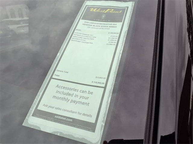 West Point Lincoln Kirkwood is pleased to offer this gorgeous 2026 Lincoln Navigator Reserve in Black Metallic with Hot Chocolate interior. Well equipped with Equipment Group 202A Reserve II (Auto Heated/Ventilated Premium Leather Captain's Chairs, BlueCruise Equipped (4-Years Included), Lincoln App, Lincoln Digital Experience, Radio: Revel Ultima 3D Audio System, SiriusXM with 360L (3 Months Trial), and Wheels: 22 Dark Tarnished Aluminum), Heavy-Duty Trailer Tow Package (26mm Engine Radiator and Trailer Brake Controller), Lincoln Connectivity Package (4-Years Included), Lincoln Security Package, 28 Speakers, 2nd Row Heated & Ventilated Dual Captain's Chair, 3rd row seats: split-bench, 4-Wheel Disc Brakes, ABS brakes, Adaptive suspension, Air Conditioning, Alloy wheels, AM/FM radio: SiriusXM with 360L, Apple CarPlay/Android Auto, Audio memory, Auto High-beam Headlights, Auto Start-Stop Technology, Auto tilt-away steering wheel, Auto-dimming door mirrors, Auto-dimming Rear-View mirror, Auto-leveling suspension, Automatic temperature control, Brake assist, Bumpers: body-color, Compass, Delay-off headlights, Driver door bin, Driver vanity mirror, Driver's Seat Mounted Armrest, Dual front impact airbags, Dual front side impact airbags, Electronic Stability Control, Emergency communication system: 911 Assist, Exterior Parking Camera Rear, Four wheel independent suspension, Front anti-roll bar, Front Bucket Seats, Front dual zone A/C, Front License Plate Bracket, Front reading lights, Fully automatic headlights, Garage door transmitter, Heated door mirrors, Heated front seats, Heated rear seats, Heated steering wheel, HVAC memory, Illuminated entry, Leather steering wheel, Low tire pressure warning, Memory seat, Navigation system: Connected Navigation (1-year trial), Occupant sensing airbag, Outside temperature display, Overhead airbag, Overhead console, Panic alarm, Passenger door bin, Passenger seat mounted armrest, Passenger vanity mirror, Power adjustable rear head restraints, Power door mirrors, Power driver seat, Power moonroof: Panoramic Vista Roof, Power passenger seat, Power steering, Power windows, Radio data system, Rain sensing wipers, Rear air conditioning, Rear anti-roll bar, Rear audio controls, Rear reading lights, Rear window defroster, Rear window wiper, Reclining 3rd row seat, Remote keyless entry, Security system, Speed control, Speed-sensing steering, Speed-Sensitive Wipers, Split folding rear seat, Spoiler, Steering wheel memory, Steering wheel mounted audio controls, Tachometer, Telescoping steering wheel, Tilt steering wheel, Traction control, Trip computer, Turn signal indicator mirrors, Variably intermittent wipers, and Ventilated front seats.